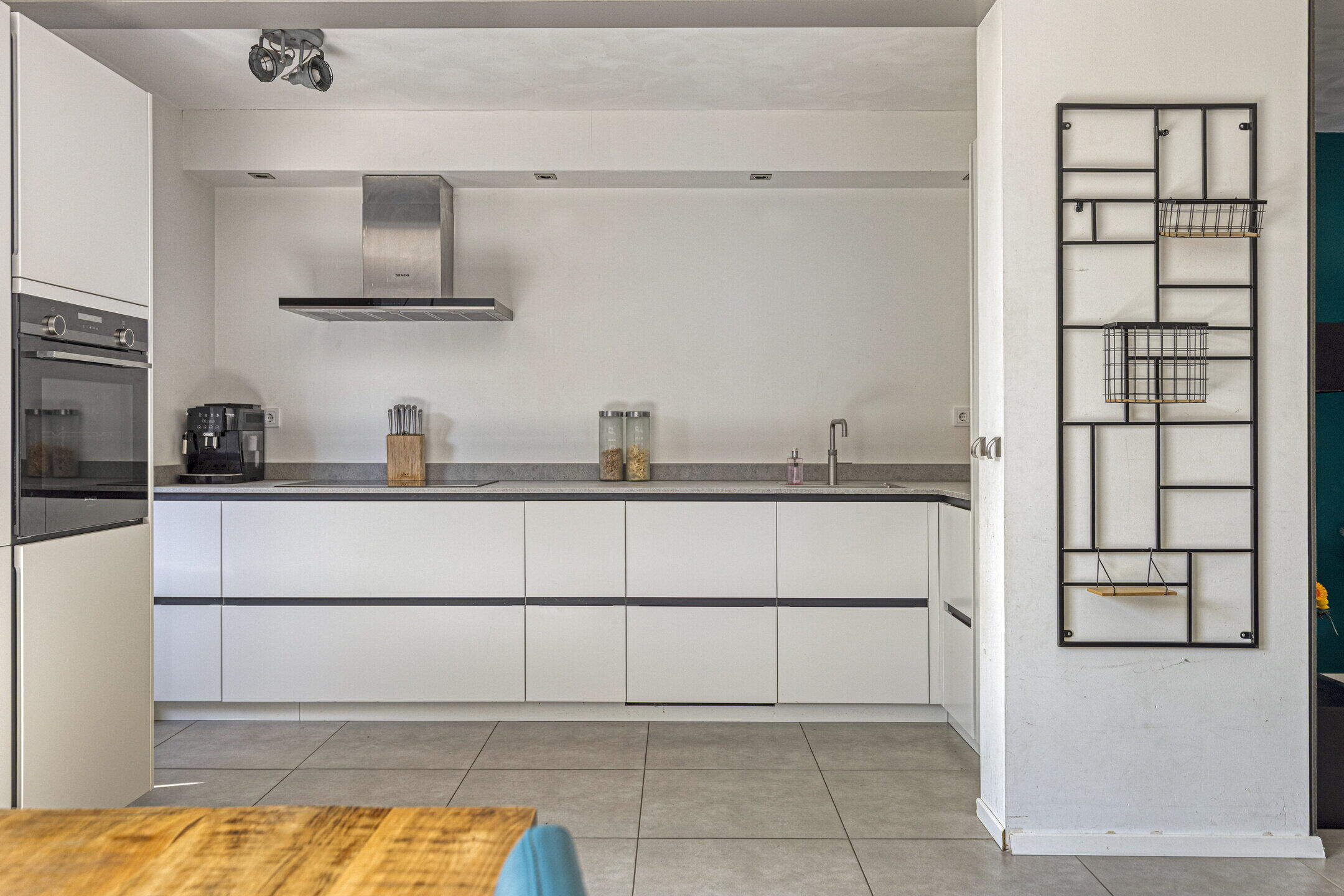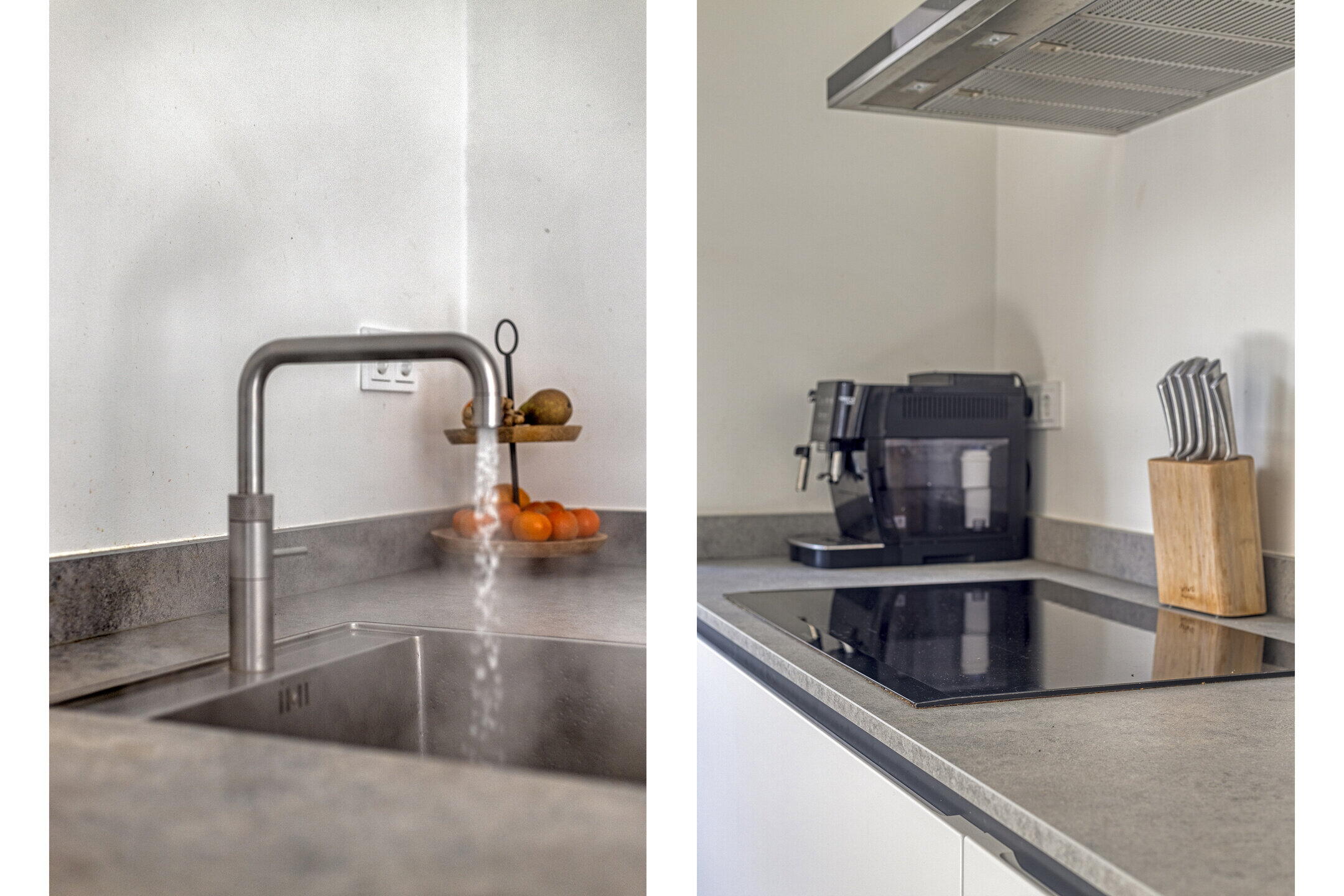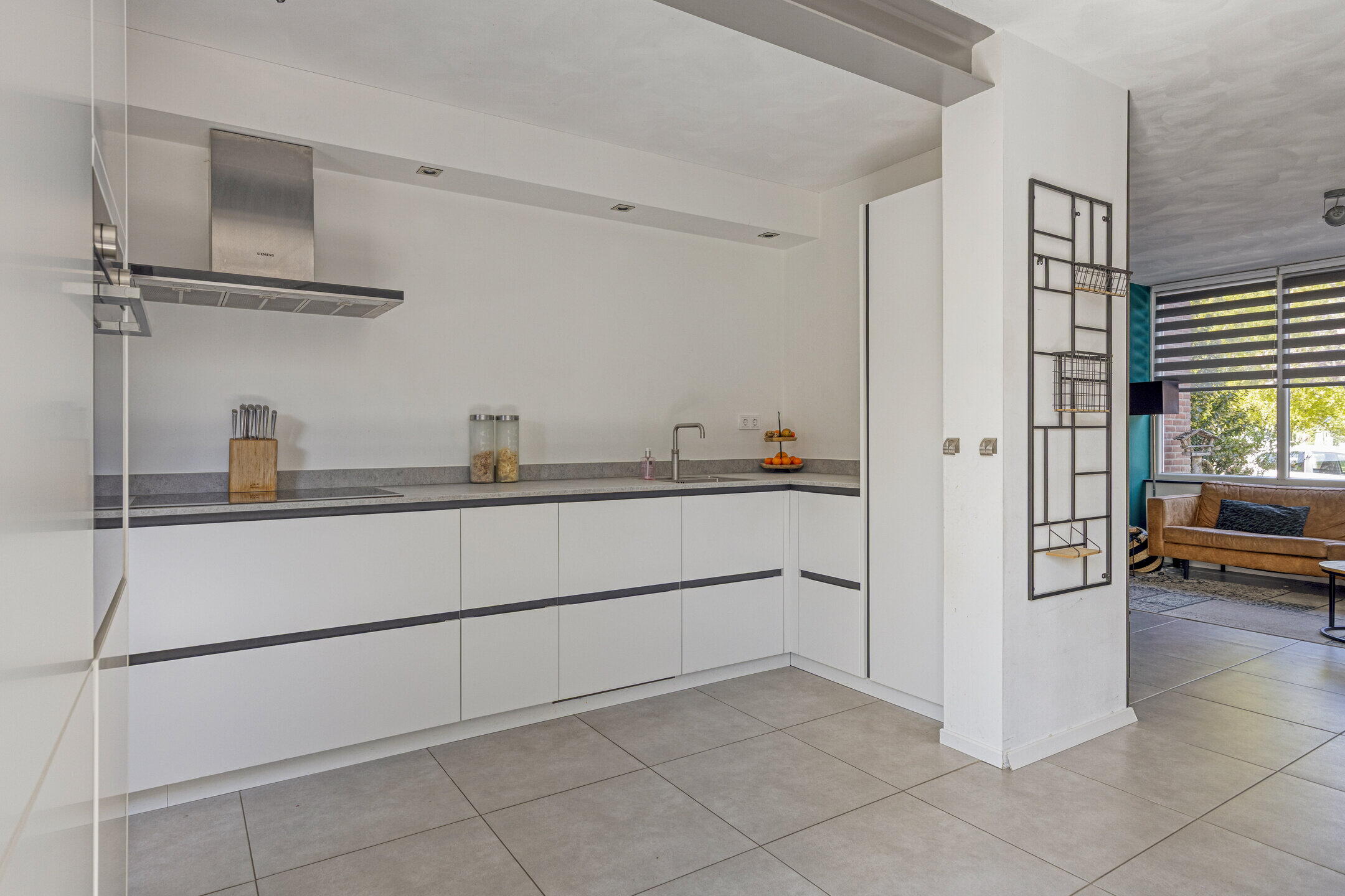 De open keuken is uitgevoerd in een frisse witte kleur en voorzien van alle gemakken, zoals een inductieplaat, quooker en oven. Met volop werk- en opbergruimte is dit een heerlijke plek voor kookliefhebbers. De keuken staat in leuke verbinding met de eettafel, wat zorgt voor een gezellige leefruimte.