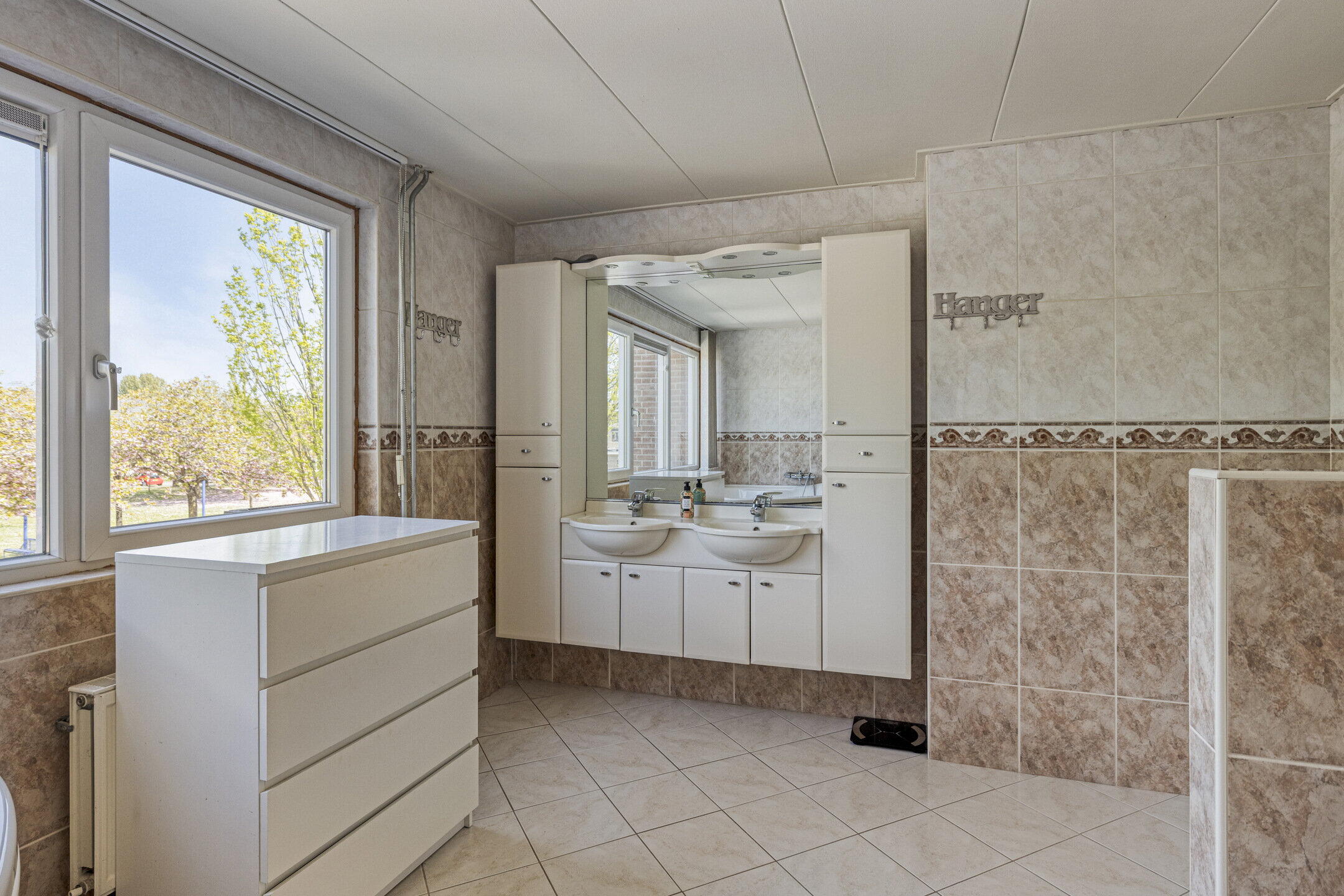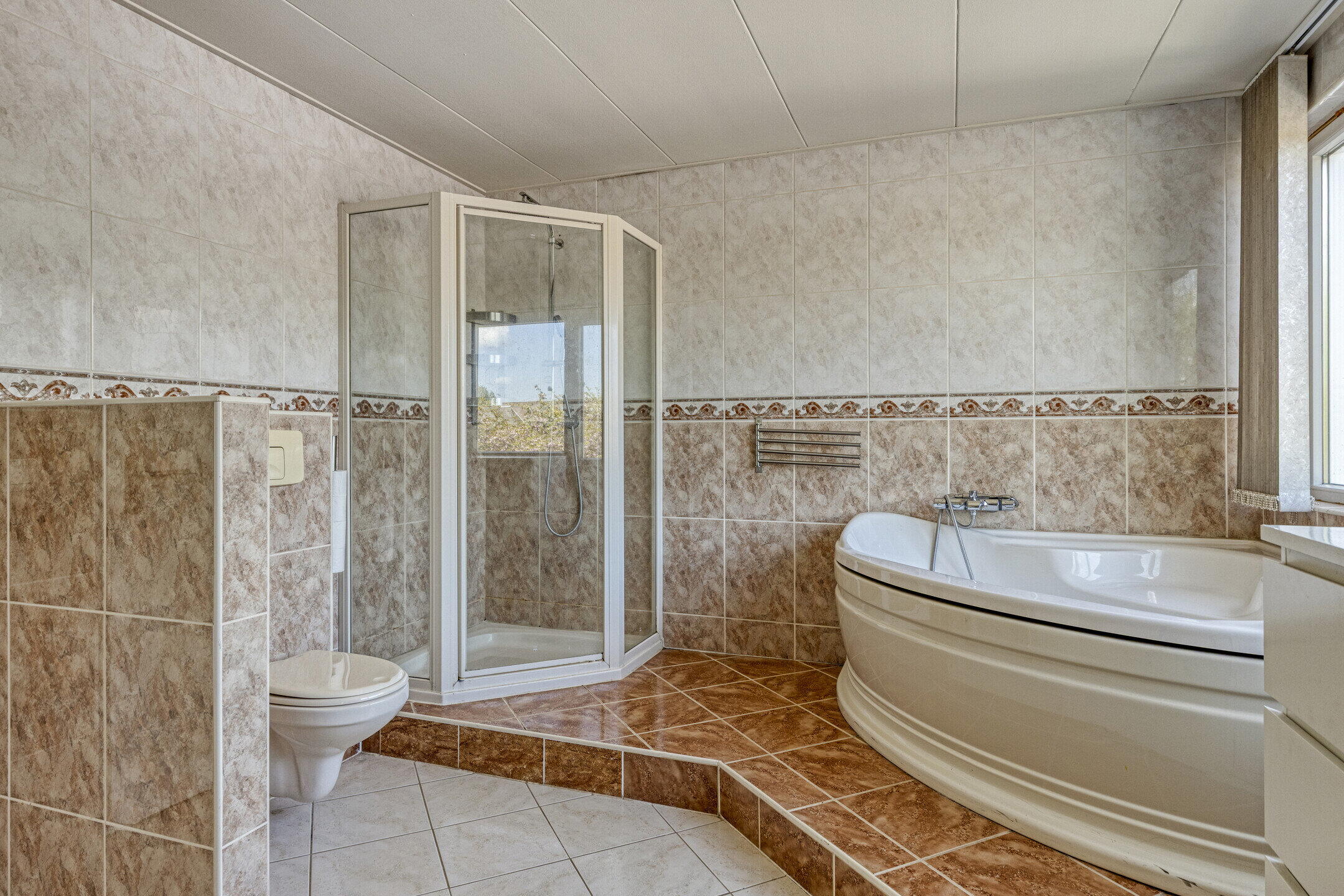 De badkamer is compleet uitgerust met een ligbad, douche, toilet en dubbele wastafel met meubel. Er is zelfs vloerverwarming aanwezig. Hoewel deze wat gedateerd is, biedt het volop ruimte en mogelijkheden om er jouw eigen draai aan te geven.